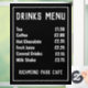 For window mounting - a drinks price-list window cling for a cafe offering beverages. Alter prices as you wish. Displays up to 6 items and prices. Black and white.
