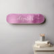 Custom girly skateboard featuring pink faux glitter dripping against a pink faux metallic foil background. Personalize with your name in a stylish trendy white script with swashes.