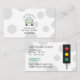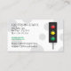 Some professional modern double-sided business cards designed for a driving school. The front features a hand-drawn car , the business name , address and phone number . The back side features a traffic light and all the important information your customers need to know . Both sides have a white background with light gray polka dots .