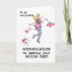 A driving test congratulations card for a girlfriend, with a girl dancing toward her car, car keys in hand and torn up L-plates scattered behind her: from a watercolour painting by Judy Adamson.