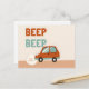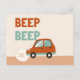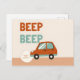 This charming postcard presents a delightful celebration of a significant milestone—passing a driving test. The front of the postcard is dominated by a playful, oversized typographic exclamation "BEEP BEEP" in alternating shades of warm russet and soft teal, evoking the sound of a car horn in a friendly and inviting manner. Below this jubilant proclamation sits a stylized, cartoon-like representation of a car, rendered in a cheerful shade of orange that conveys a sense of excitement and energy.