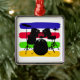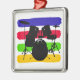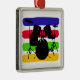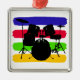 Silhouetted drum kit with brightly colored paint swatches in background, printed on a Christmas ornament