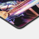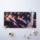 The artwork by ZoeSPEAK on this Desk Mat is an original photograph of a drum set. The shiny black drums with their silvery rims reflect the colors of the lights in the studio, blues, reds and greens. Cymbals above the drums wait to be struck.