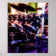 The artwork on this Poster is an original photograph of a drum set. The shiny black drums with their silvery rims reflect the colors of the lights in the studio, blues, reds and greens. Cymbals above the drums wait to be struck. The photo is called “The Drummer”, since the drummer can be found in the picture. But this text can be personalized, or deleted if you prefer.