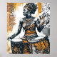 Celebrate the heartbeat of African heritage with this stunning illustration of a tribal woman playing the drums. Clothed in vivid orange fabrics and adorned with traditional jewelry, her poised expression and rhythmic hands evoke a sacred connection to ancestral rhythms. The bold patterns and abstract strokes give this piece a raw, spiritual energy that commands attention.
