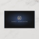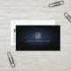 This simple yet very elegant business card features a simple gold icon of drummer percussionist drum enclosed in a gold circle. Your name appears in matching colors and easy to read font below this icon. The background is jet black with a subtle blue glow in the center of the card, behind the name and icon, giving the card a striking look. Perfect for music, musician, music instruments, entertainment, show business, artistic, performing arts, musical skills themes.
