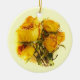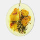 This lovely holiday ornament features a still life composition of exquisite dried roses on a yellow background. The petals range in color from pale yellow through gold to a deep orange apricot. The image is repeated on the back.