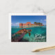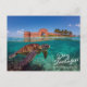 Stunning photographic postcard with a split-level view showing a sea turtle swimming in the clear blue water below, and above the surface, Fort Jefferson on a tropical island with palm trees, labeled "Dry Tortugas National Park." Captures the unique blend of history and marine life in the Florida Keys. Ideal for sea turtle lovers, divers, history buffs, and Florida travelers.