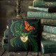 A female dryad with beautiful green leaves in a backdrop of black with a large orange butterfly