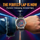 This dynamic watch face features two custom hot rod cars, one prominent in blue with orange flames, and another smaller, pink one in the background. Both vehicles are surrounded by vibrant, stylized flames and are set on a dark, reflective surface suggesting intense speed. The overall design is a powerful and bold celebration of classic car culture.
