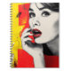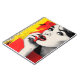 Two women are depicted in a vibrant, pop art style, one in shades of blue and yellow and the other in grayscale with bold red lipstick. The background features a mix of abstract patterns in red and yellow tones.