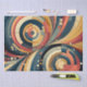 The composition is split into two main sections, each dominated by a large circular form that seems to be in motion. This creates a sense of balance and contrast, reflecting the concept of duality. The color palette is a harmonious blend of primary colors—red, yellow, and blue—accentuated with shades of beige. These colors are thoughtfully combined to create a vibrant and cohesive look.
