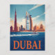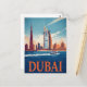 Witness the vibrant energy of the Dubai skyline in this stylish retro-pop postcard. Featuring a dynamic illustration of the towering Burj Khalifa and Burj Al Arab from the water, this design includes a speedboat cutting across the turquoise sea. It highlights the modern, luxurious, and fast-paced atmosphere of the United Arab Emirates and is a great piece for fans of striking cityscapes and travel posters.