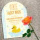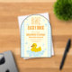One lucky duck! First birthday featuring a rubber duck and bubbles against a light blue gingham and pale yellow background with orange text