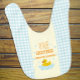 One lucky duck! First birthday featuring a rubber duck and bubbles against a light blue gingham and pale yellow background with orange text