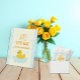 One lucky duck! First birthday featuring a rubber duck and bubbles against a light blue gingham and pale yellow background with orange text. Photo template via Pixabay licensed under CC0 and must be replaced with your own photo