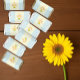 One lucky duck! First birthday featuring a rubber duck and bubbles against a light blue gingham and pale yellow background with orange text