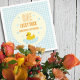 One lucky duck! First birthday featuring a rubber duck and bubbles against a light blue gingham and pale yellow background with orange text