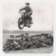 VINTAGE BLACK AND WHITE PHOTO OF A MILITARY MOTORCYCLE JUMPING OVER A ROW OF TROOPS.
