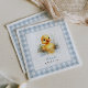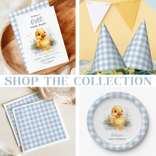 "One lucky duck" first birthday paper napkins with a cute duck design and a blue gingham pattern.