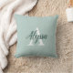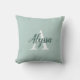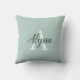 Duck Egg Green Monogram Script Throw Pillow, each side of the pillow features a white monogram initial and a dark emerald green name, on a duck egg color background. The pillow is easy to personalize by typing the name and monogram initial of your choice into the online personalization template before ordering. The text automatically copies across to the other side of the pillow to show the identical name and initial on each side.