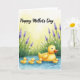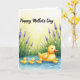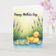 This greeting card shows a sweet family of bright yellow ducks gliding across soft blue water, with a larger fluffy adult leading three smaller ducklings close behind like a gentle little parade ❤️. Their tiny orange beaks and rosy cheeks give them an affectionate, friendly look, and the way they follow closely suggests a caring bond. Small ripples trail behind them, adding a calm sense of motion without disturbing the quiet scene. Behind the water, tall green reeds rise up with scattered white blossoms, creating a cozy natural setting that feels like a peaceful walk together. A few slender stems topped with purple spiky flowers add contrast and height, like little accents reaching into the air 🌼. Near the top, a short greeting line sits centered in a dark ink color that stands out against the light background. The sky area fades into a soft yellow glow, warming the whole picture and making the ducks’ feathers look extra sunny. The adult duck is placed slightly ahead on the left, with the three ducklings trailing in a neat line to the right, all floating on a pale blue wash with gentle wave marks.