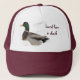 This hat features a mallard duck, very surprised to find himself surrounded by fluffy white snow from an early storm. His lovely green iridescent neck, yellow beak and intricately patterned wings really stand out against all that white! The text reads: Lord love a duck. It can be customized or removed.