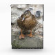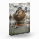 This awesome decoration features a photograph of a beautiful brown duck with a bright orange beak. The duck is standing on a wall overlooking a lake and looks like it is deep in thought.