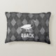 Appealing to the more eccentric individual, this rectangular accent pillow features a black and gray grungy argyle print, with a white pictogram of a duck. The customizable white text features the word "QUACK." An enigmatic and inexplicable item!