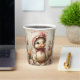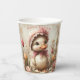 Paper Cups with a white baby duckling sitting in a garden of Spring Daisies and Tulips. She is wearing her favorite pink bonnet and bow around her neck.