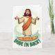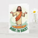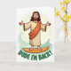 This card shows a stylized, bearded man with flowing brown hair, drawn in a friendly cartoon look, standing on a bright orange surfboard with his arms spread wide as if greeting someone he’s missed. He wears a pale robe tied with an orange sash, and his big smile reads like a warm reunion between close friends. Behind him, soft teal-green waves curl and roll, framing him in the center like a stage set on the sea. A green-yellow glow fans out from behind his head, giving the scene a gentle, radiant backdrop without taking away from the casual humor. Near the bottom, rounded green text says “DUDE I’M BACK!” and it follows the curve of the wave as if it’s riding along with him. The mix of warm oranges and cool greens sets up a fun contrast that feels like a friendly wink, with a little springtime energy 🌷. Thick outlines and smooth shapes keep everything easy to read, while the white background leaves lots of open space around the waves 🐰. The surfboard tilts slightly upward, cutting across the lower center as teal water swells on both sides.