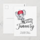 Adorable baby elephant wearing red knit cap with white pom pom, "Due in January" typography, and template for special message announcing pregnancy.