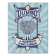 Dumbo stands on a tall circus podium, proudly holding up his magic feather. This circus attraction art reads: "Dumbo: The Magnificent Flying Elephant".