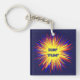 An acrylic keychain which features a political starburst abstract pattern in red, yellow and blue with the words Dump Trump in the center. Text can be customized.