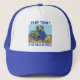Blue and white trucker hat with Dump Trump and the trash he spews slogan from Take Out our trash.com