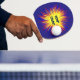 A ping pong paddle featuring a political starburst abstract pattern in red, yellow and blue with the words Dump Trump in the center. Text can be customized.