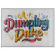 A whimsical and playful design featuring the text "Dumpling Duke" in a hand-drawn, colorful cartoonist font with swirling flourishes. The vibrant colors and playful typography create a sense of fun and excitement.