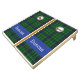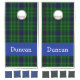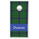 Stylish personalized Cornhole game set done in the green, blue, white, black, and red tartan plaid of the Scottish clan Duncan. A solid blue band has custom white text. Personalize for yourself or as a great gift idea.