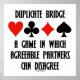 Showcase your wry duplicate bridge humor side with this poster featuring the four card suits along with the saying "Duplicate Bridge A Game In Which Agreeable Partners Can Disagree". Make everyone do a double-take at the bridge table with a dose of bridge attitude today. Great poster gift for any avid bridge player or bridge club!