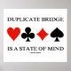 Showcase your wry duplicate bridge humor with this poster featuring the four card suits along with the saying that any duplicate bridge player will agree with: "Duplicate Bridge Is A State Of Mind".