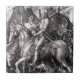 Albrecht Durer Knight Death and the Devil tile. Woodcut engraving from 1513. One of Northern Renaissance artist Albrecht Durer’s most famous engravings, Knight Death and Devil is an allegorical work featuring a northern European knight riding in full armor on a horse flanked by Death, who holds an hour glass, and the devil in the form of the a goat. The work represents the Christian struggle against time and temptation. A great gift for fans of Albrecht Durer, Northern Renaissance Art, Woodcut Engravings, and knight and medieval depictions.