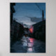 A dark alley at dusk with a lone figure walking into the distance