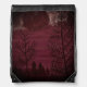 Abstract design of a forest bathed in crimson hues highlighting twilight dusk as night falls