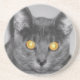 A photograph looking straight in the face of a grey cat with golden glowing eyes. Edited with selective coloring to emphasize the mesmerizing eyes.