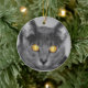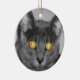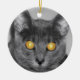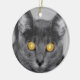 A photograph looking straight in the face of a grey cat with golden glowing eyes. Edited with selective coloring to emphasize the mesmerizing eyes.