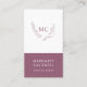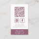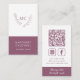 Dusky Purple Monogram Wreath with Slogan Vertical Business Card... The front of our unique dusky purple business card features an elegant botanical wreath bordering your two monogram initials in purple-hued ink on a white background. Your name and title (or company name) appear in white ink on a dusky purple rectangle bordering the bottom of the business card, giving an authoritative structure to balance the delicate leafy wreath. On back of the card are your phone number, social media contact info, website address and QR code linking to additional information. The dusky purple section on bottom contains your business motto or tagline. Example text currently shows "Always take the high road" in white script typography. All text and the QR code can be easily revised on the personalization template.