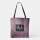 On this stylish tote bag is a leopard print pattern on an ombre dusky violet backdrop for extra pop. In the center is a black square where you can personalize it with a letter and name to make it uniquely your own. Sleek chic vibes.