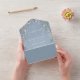 All-in-one wedding invitation featuring floral greenery and elegant typography on a dusty blue background. The invitation includes a perforated RSVP card that features your wedding website QR code. Designed by Thisisnotme©