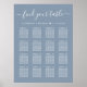 Chic downloadable dusty blue wedding seating chart poster sign for up to 16 tables featuring "find your table" in a stylish white script with swashes, your first names and wedding date joined together by a heart and the table numbers and guest names in simple white typography. The digital download option allows you to edit with last minute changes and print locally.