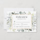 Design features an elegant printed gold colored geometric frame on the front with eucalyptus and floral greenery leaves in shades of green, dusty blue, gray and more. The back features a dusty blue-gray shade watercolor wash textured background with a matching leaf branch element.